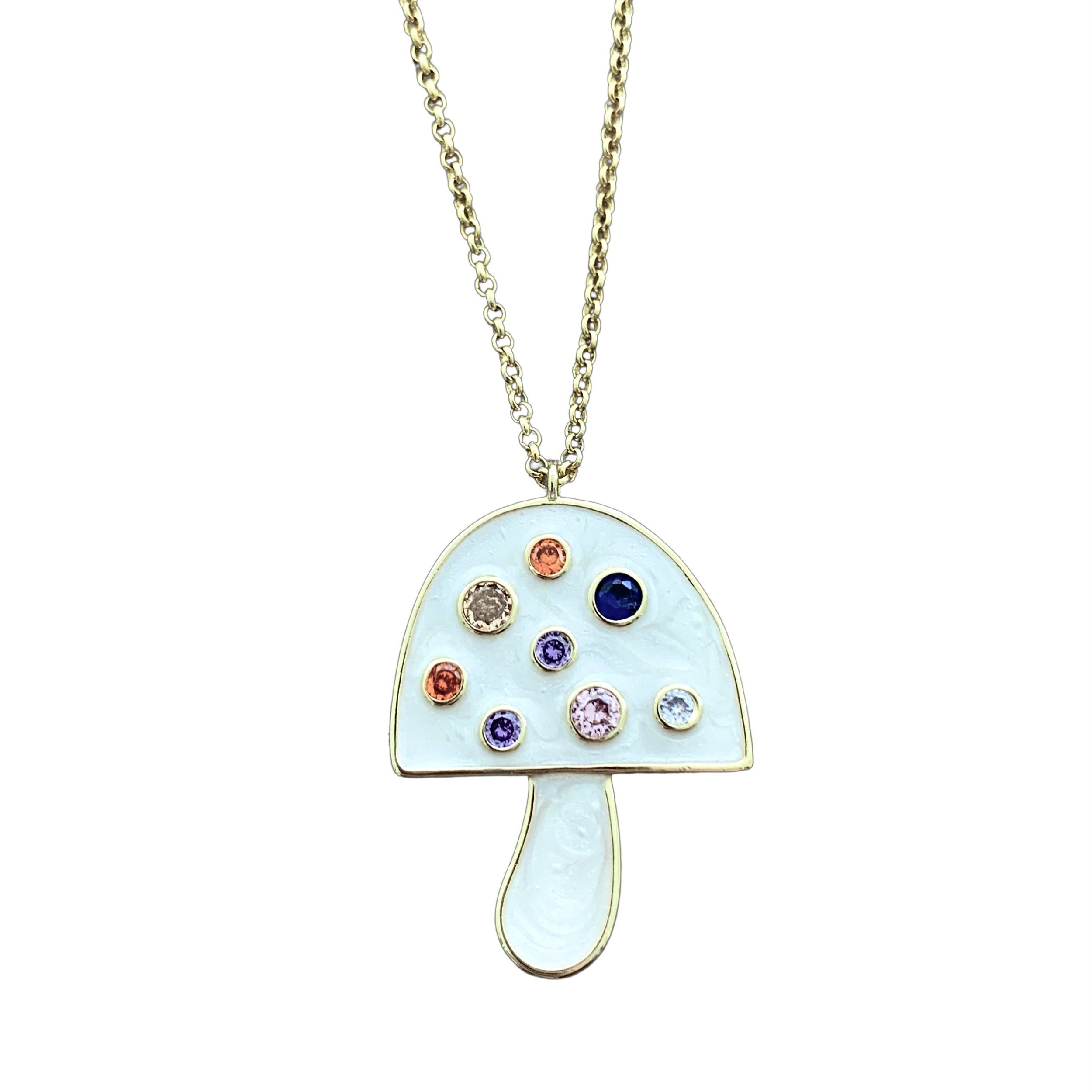 Colar banhado a ouro com pingente esmaltado de cogumelo com mini zircônias coloridas.