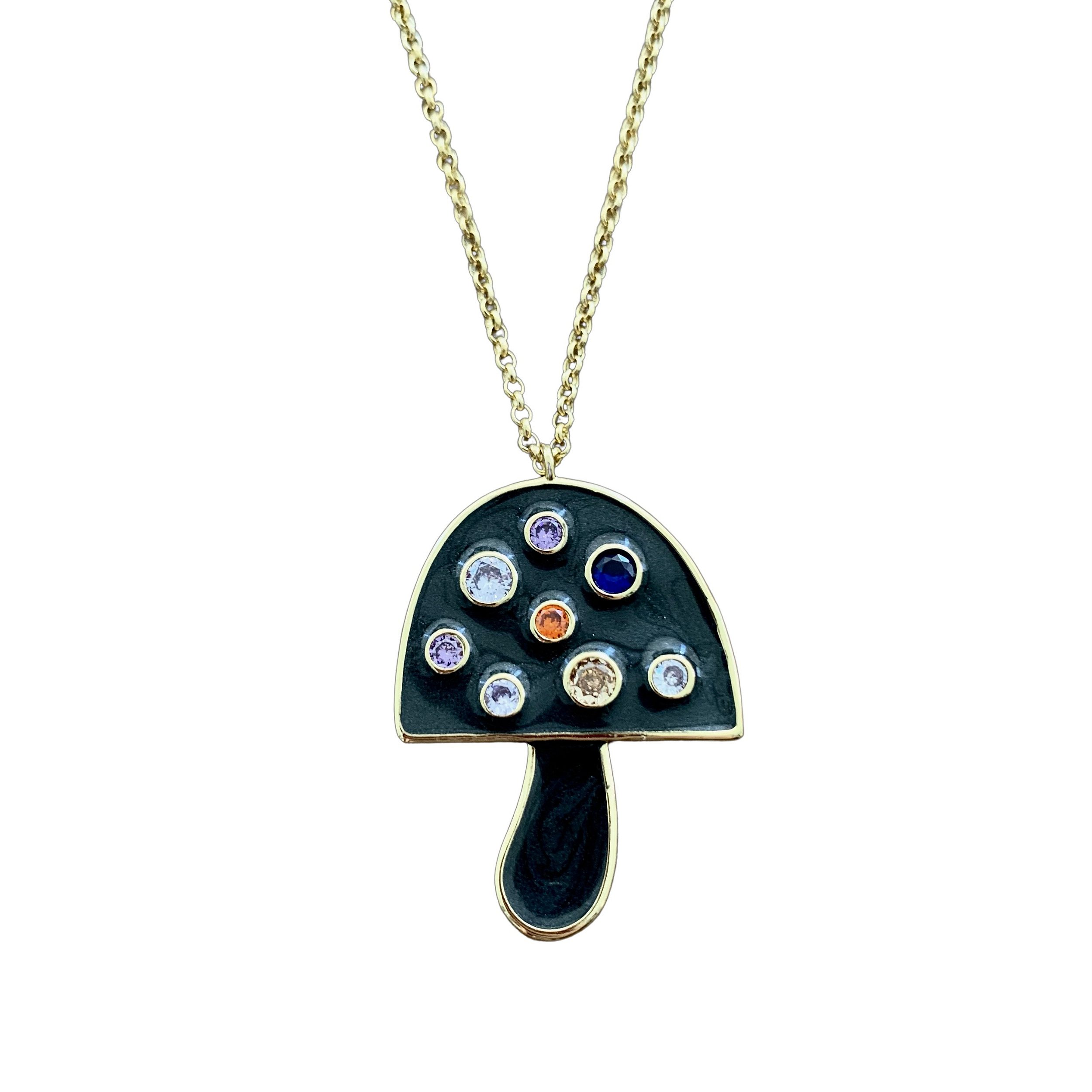 Colar banhado a ouro com pingente esmaltado de cogumelo com mini zircônias coloridas.