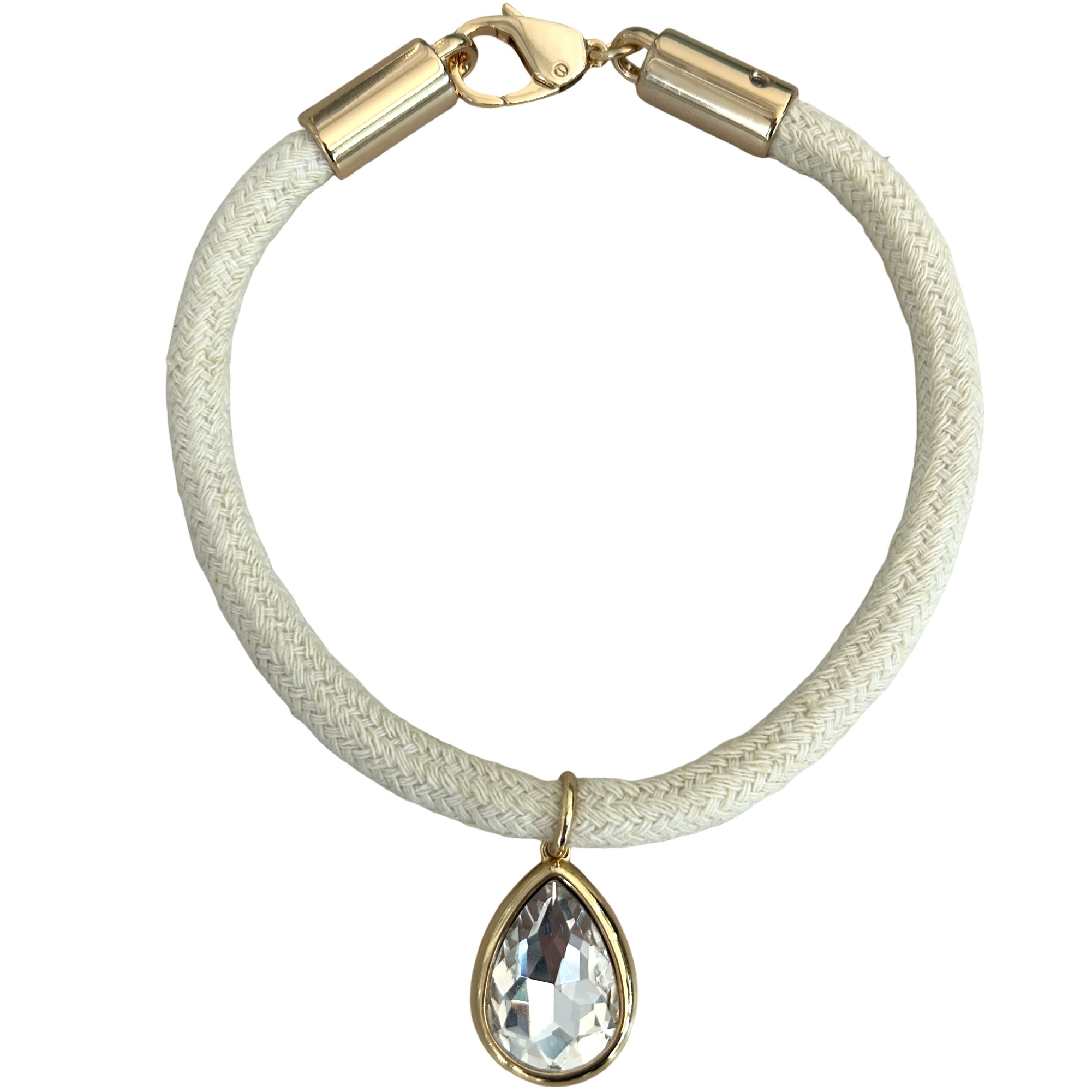 Colar de cordão grosso de algodão com pingente de gota de cristal. Metais dourados com verniz italiano.