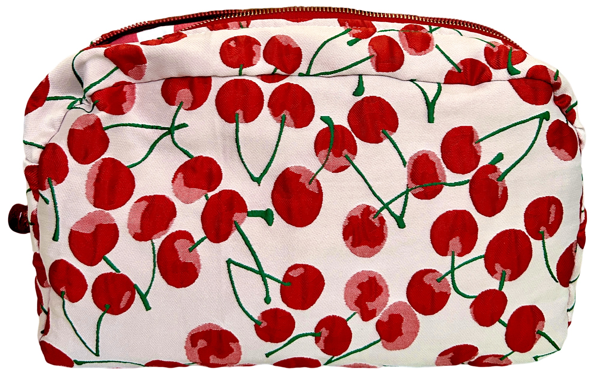 Necessaire dupla face de jacquard com estampa de cereja e tricoline vichy vermelho.